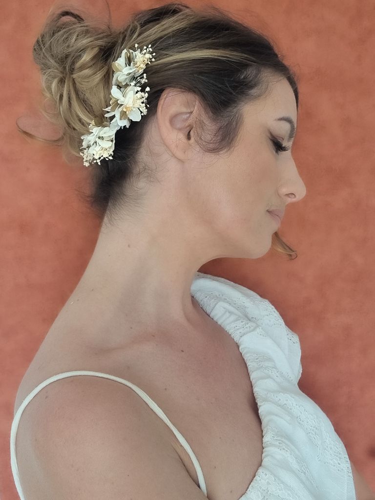 4pics cheveux mariage cérémonie fleurs éternelles blanc et dorés, dorés à l'or fin.