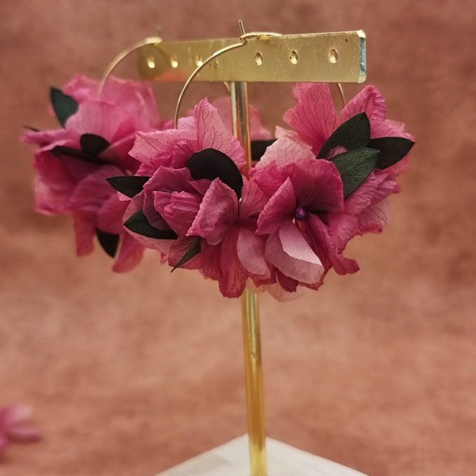 Boucles d'oreilles créoles fleurs éternelles hortensia rose fuchsia mariage doré à l'or fin.