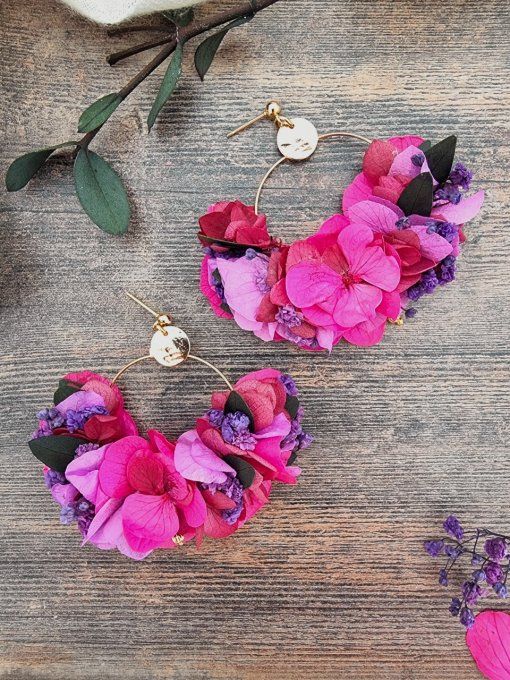 Boucles d'oreilles créoles fleurs éternelles hortensia rose fuchsia parme mariage doré à l'or fin